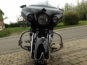 Am letzten Samstag hatte ich Gelegenheit, eine Chieftain zu Fahren. Ging mir wie Franky, erst mal unsicher mit dem Handling. Wenn dann aber das Schritttempo überwunden ist, geht es ohne Probleme. Wozu 6 Gänge? Ein wenig am Gasgriff gedreht und schon ist man im illegalen Geschindigkeitsbereich. Und da ist mächtig Dampf vorhanden.