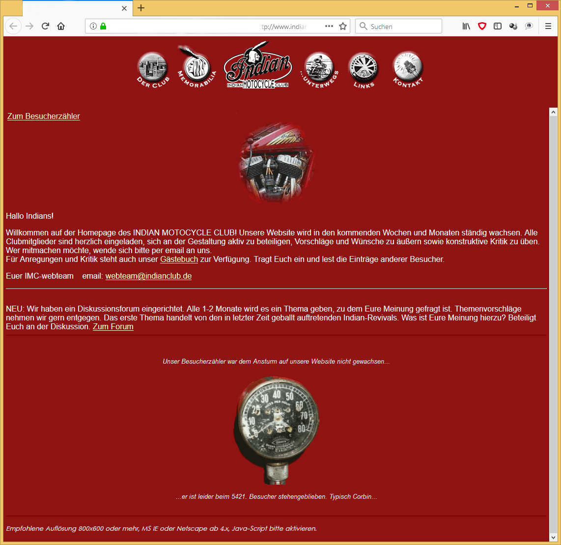 Zur Erinnerung an die Anfänge habe ich einen Screenshot unserer Webseite aus dem Jahr 1999 angehängt. Der Text auf der Seite ist zwar 20 Jahre alt, hat aber immer noch Gültigkeit. Wer also Vorschläge, Wünsche oder Ideen hat, wie wir unsere Internetpräsenz verbessern können, möge mir diese bitte mitteilen. Ein langgehegter Wunsch war unter anderem, dass unser Club sich aktiv auf Facebook präsentiert. Dies ist ein sehr alter Wunsch, den ich persönlich nicht erfüllen konnte. Er wurde aber nicht vergessen. In Kürze soll damit begonnen werden, das Profil des INDIAN Motocycle Club‘s auf Facebook mit Leben zu füllen. Wer sich aktiv daran beteiligen möchte, unseren Club auf Facebook zu präsentieren, sollte sich mit unserem Präsidenten Wolfgang in Verbindung setzen.