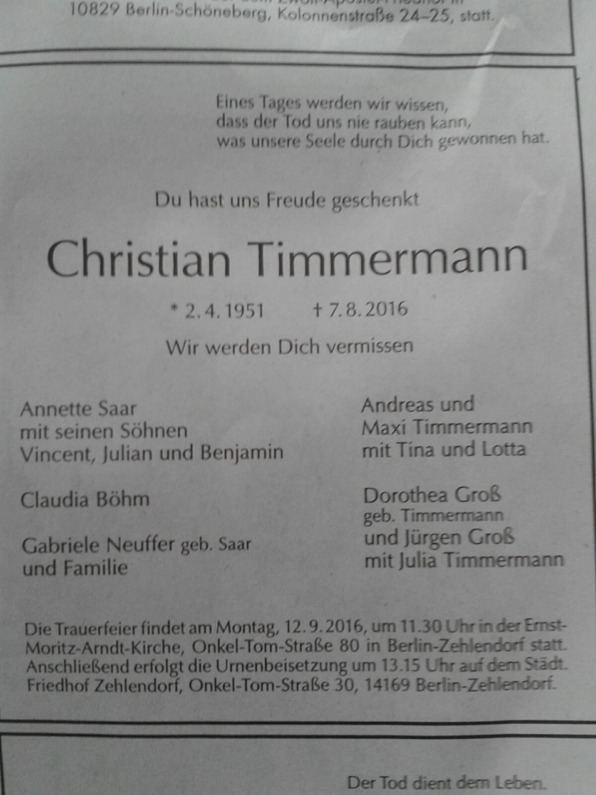 Wie ich soeben heute morgen (10.08.2016) über verschiedene Kontakte auf Facebook erfahren habe, ist Christian Timmermann kürzlich völlig unerwartet verstorben.